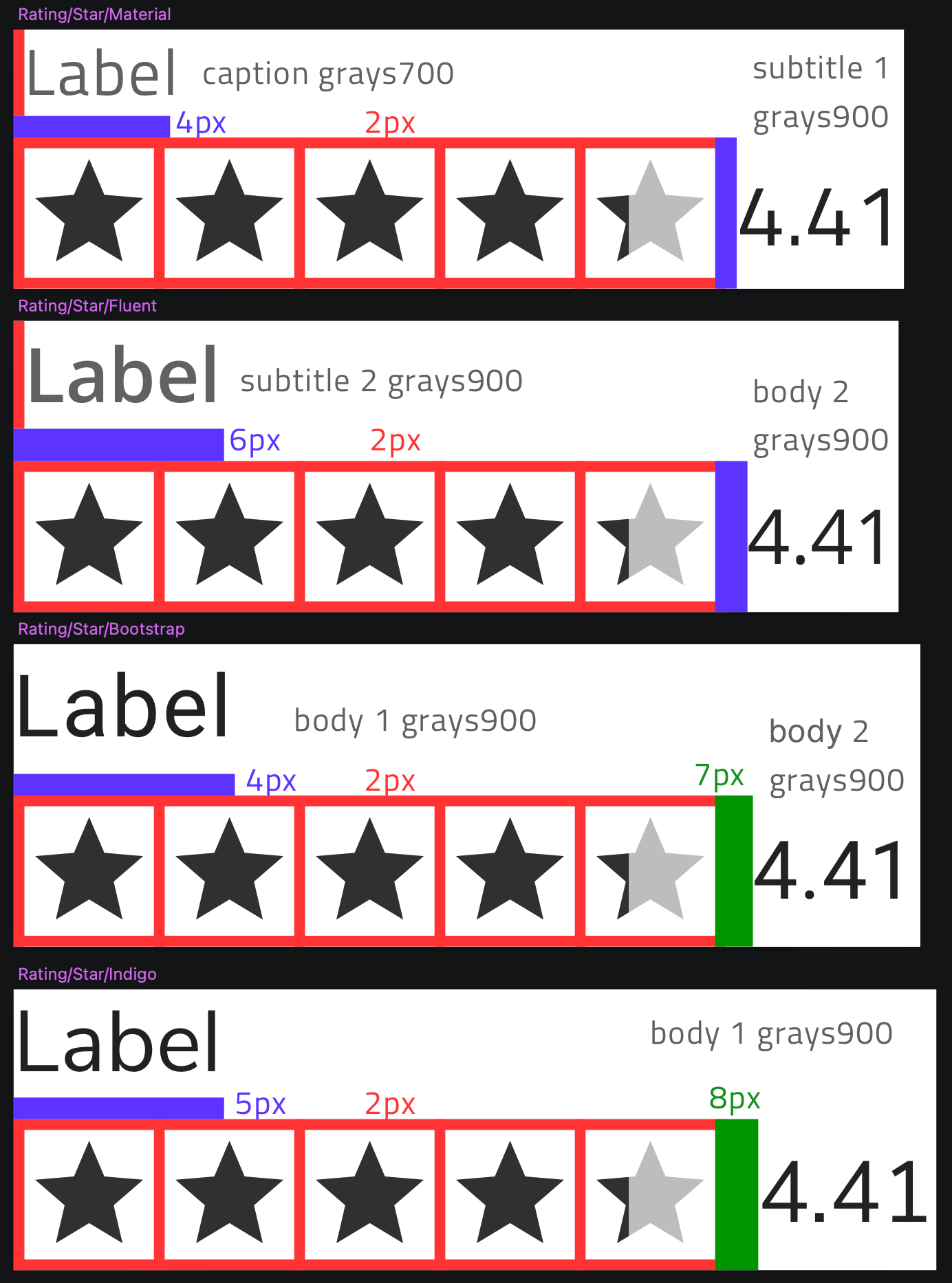 The rating component should come in a default size where each of its elements will be 24x24 px with padding around it shown on the image below. It should be easy to change that element size e.g. to 18x18 or 36x36 in order to make it smaller or larger. The rating component supports label above the graphics and value label adjacent to the graphics, both of these are text elements.
