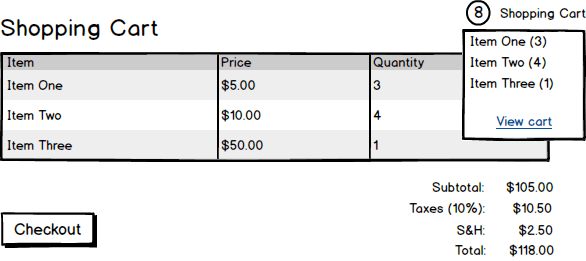 - A view that displays amount of items in cart, with a detailed dropdown.