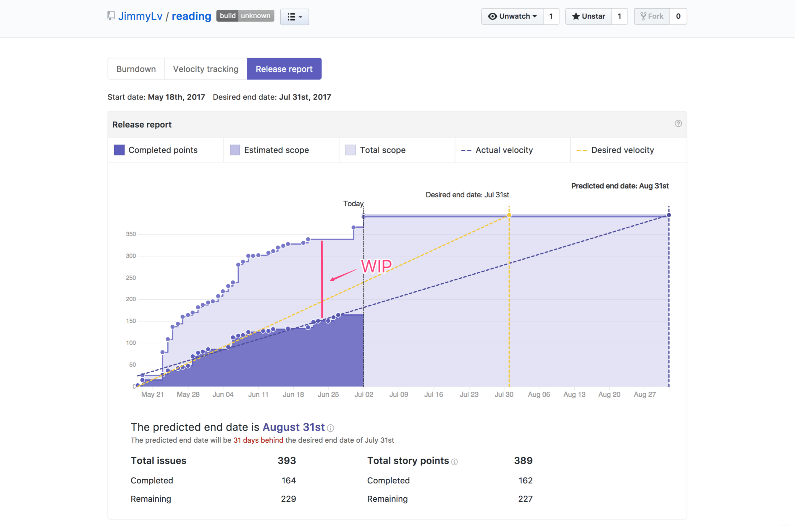 里特定律(Little’s law)告诉我们交付时间(Delivery time)依赖于在制品数量(Work In Progress, WIP)。WIP 是指所有已经初始但还未完成的工作,例如:所有在分析(Analysis)与完成(Done)之间的工作。必须要首先留意的就是 WIP,如果 WIP 增加了,交付日期就会有风险。ZenHub 所提供的 Release Report 中最有效果的就是预测完成日期,总之就是跟敏捷方法结合起来,使用项目管理的方式来管理自己的阅读列表,当然其实我也在进一步的探索之中,但是每次看看到这个走势图就能对自己的阅读列表有了更多的掌控和理解,至少减少了文章堆积时所产生的焦虑感。