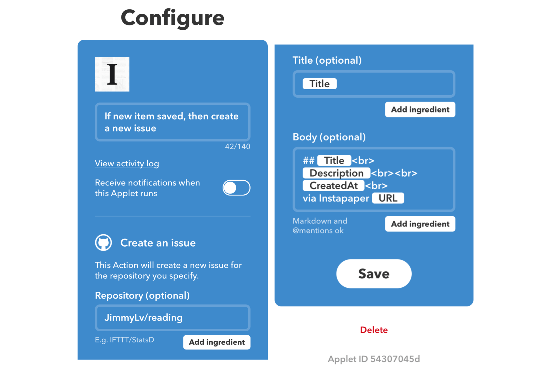 }得益于 IFTTT 非常丰富的第三方服务,IFTTT 可以直接创建 Instapaper 与 GitHub Issue 相集成的 Applet:If new item saved, then create a new issue - IFTTT,就可以在当 Instapaper 新增文章的时候,自动在 GitHub 所指定的仓库 Issues · JimmyLv/reading 中创建一个新的 Issue 并添加相应的标题、链接以及描述等相关信息。