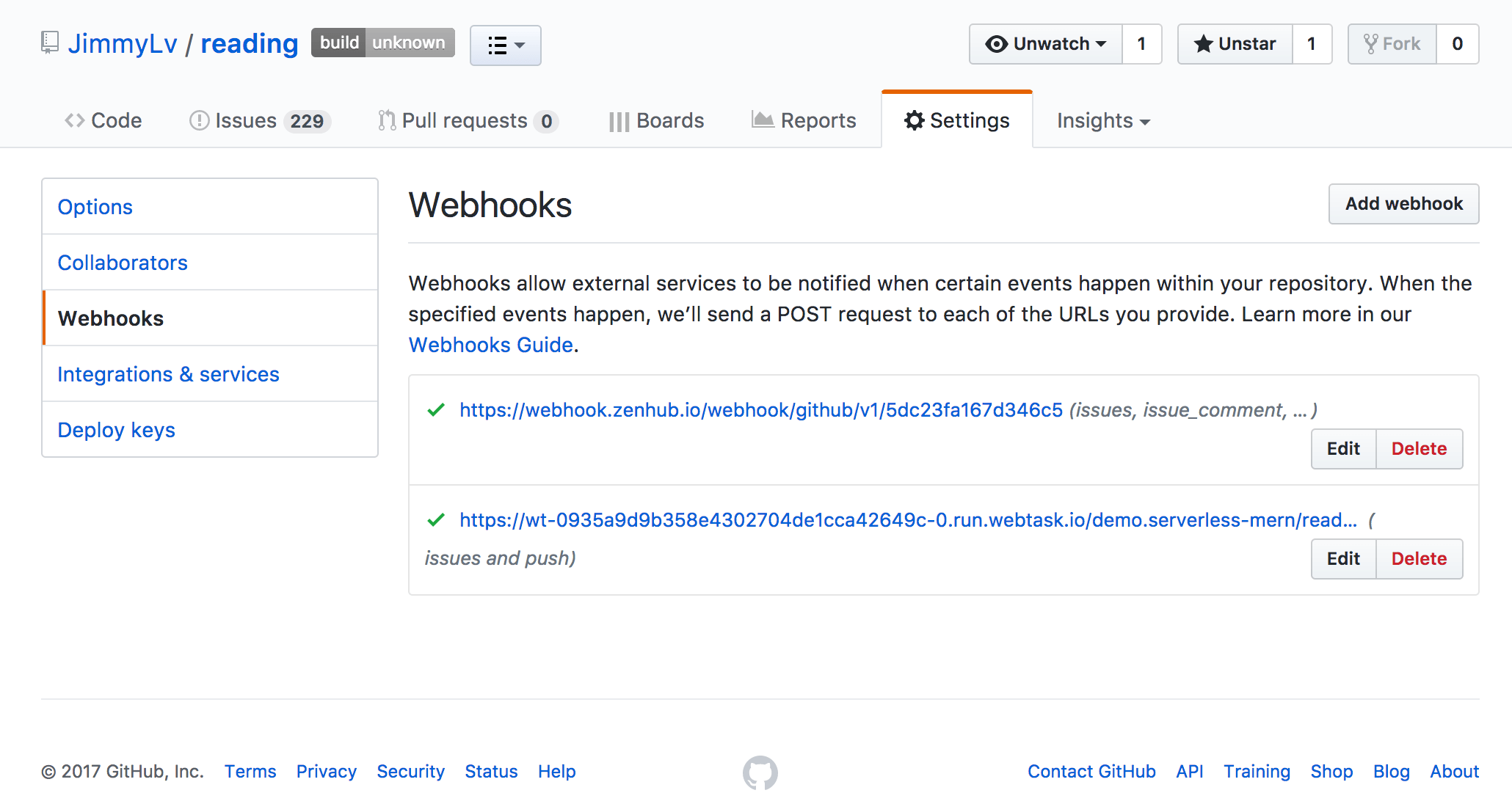 但仅仅只是添加一个 Issue 还不够,这时候还需要将这个 Issue 加入到指定的 Milestone 从而利用 ZenHub 的图表功能,使用 GitHub 的 Webhooks 功能就可以轻松帮我们把 Issue 更新的状态转发到我们所指定的 webtask 地址: