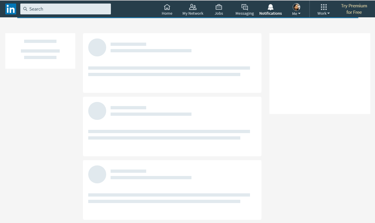 - 使用 skeleton screen 响应式布局:如上图 LinkedIn 所做的那样,首先展现给用户一个页面的空白版本,然后在这个页面中逐渐加载和填充相应的信息。否则中间的信息流部分的内容最初是空白的,然后在 JavaScript 被加载和执行过后,信息流就会因为需要占用更多的空间而推动整个页面的布局。虽然我们可以控制页面来固定中间部分的高度,但在响应式网站上,确定一个确切的高度往往很难,而且不同的屏幕尺寸可能会有所不同。但更重要的问题是,这种高度尺寸的约定会让不同团队之间产生紧密的联系,从而违背了微前端的初衷。