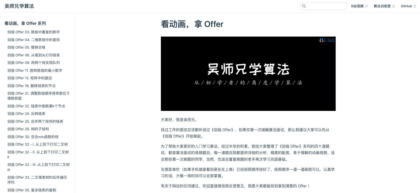为了帮助大家更好的入门学习算法,经过半年的积累,我给大家整理了《剑指 Offer》系列的四十道题目,都是算法面试的高频题目,每一道题目我都提供详细的分析、精美的配图、易于理解的动画视频,适合那些第一次刷题的同学,当然,也适合重复刷题的老手再次学习巩固基础。