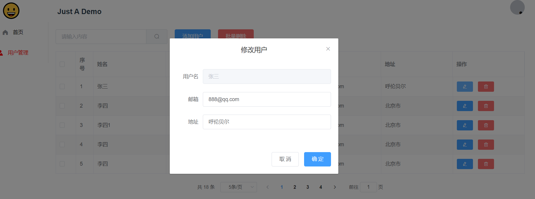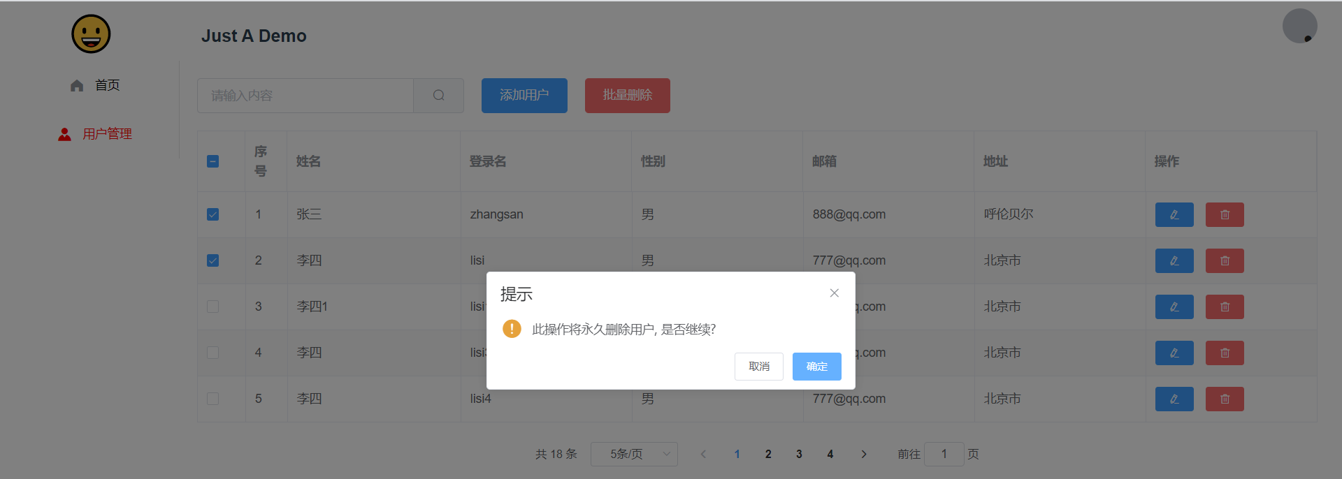 SpringBoot+Vue前后端分离入门示例,本示例实现了登录功能和用户管理功能。