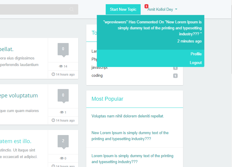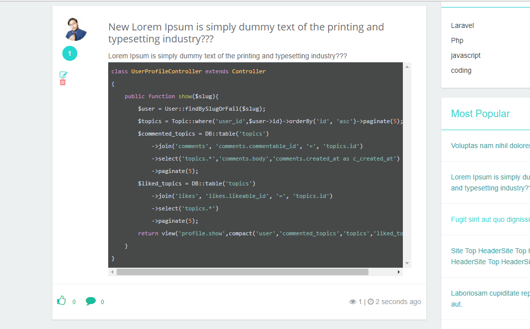 Laravel Forum Laravel Forum Platform. Features Social Login Mail and Database Notification Algolia Instant Search SEO friendly URLs Markdown Editor Code Highlighter Tag UI User Profile Feed Email Confirmation On Registration Topic Views Count Sorting More...