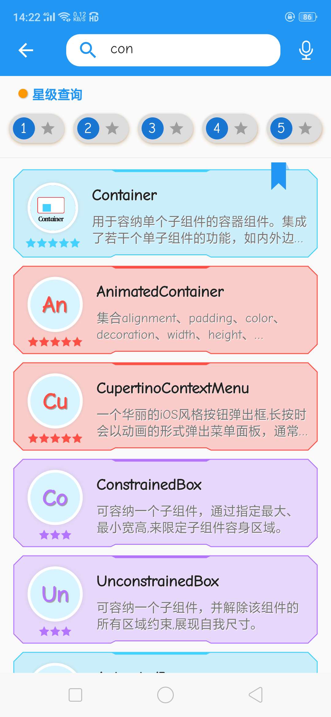 由于Flutter中Widget比较杂乱,不太好分类,所以搜索是非常重要的 另外可以根据星级进行过滤,支持多选。目前正在考虑根据功能分类,之后会有所完善。